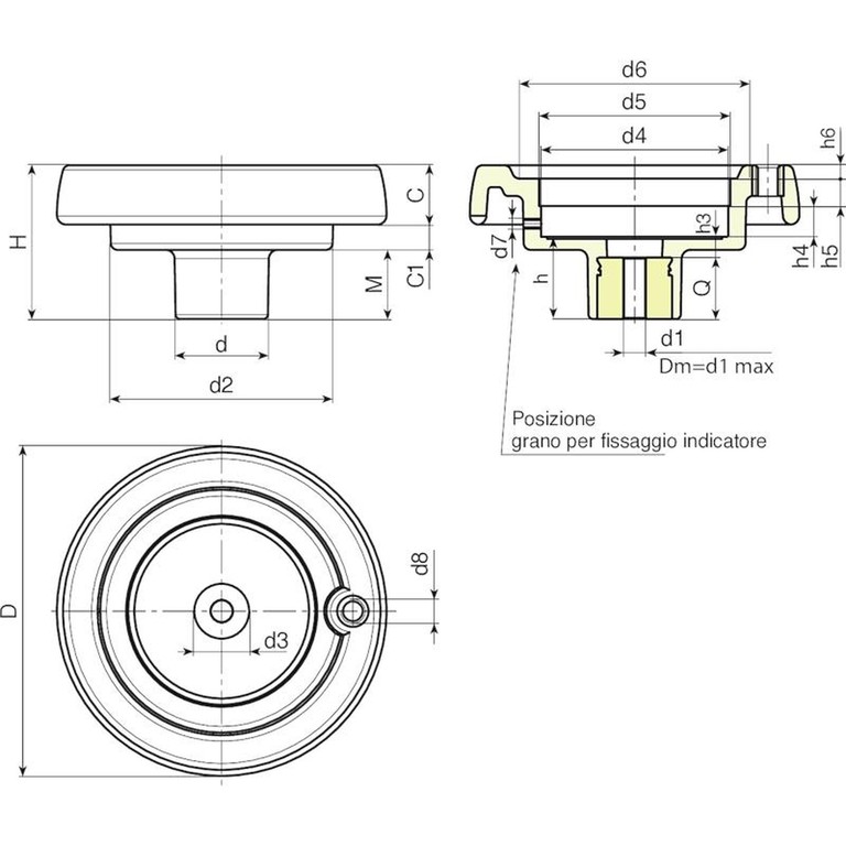 | Codice | art. | D | H | d | d2 | M | C | C1 | d3 | d4 | d5 | d6 | d7 | d8 | h | h3 | h4 | h5 | h6 | Dm | d1 | Q | Peso (g) |
