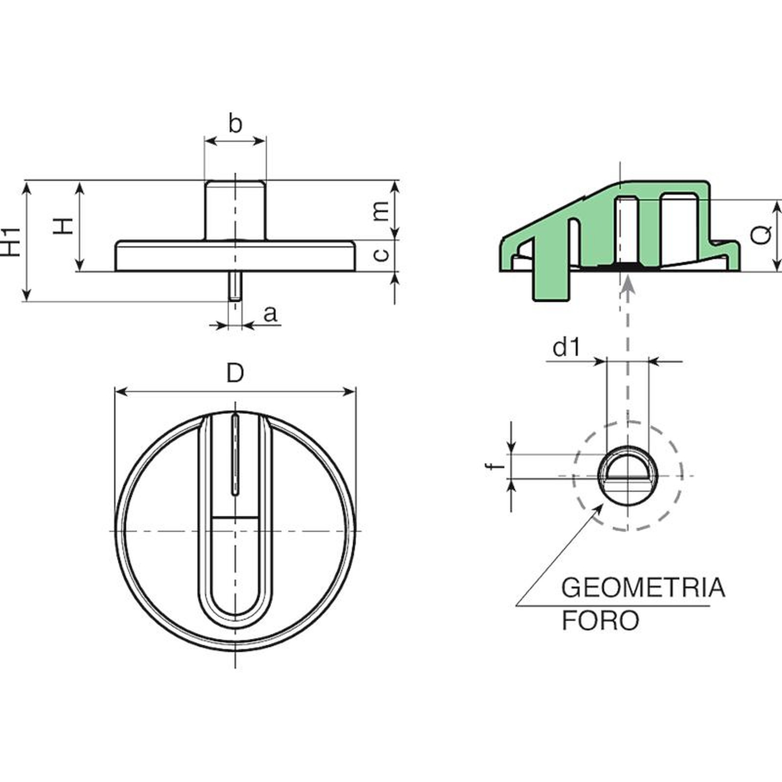 | Codice | art. | D | H | H1 | a | b | c | m | f | d1 | Q | Peso (g) |