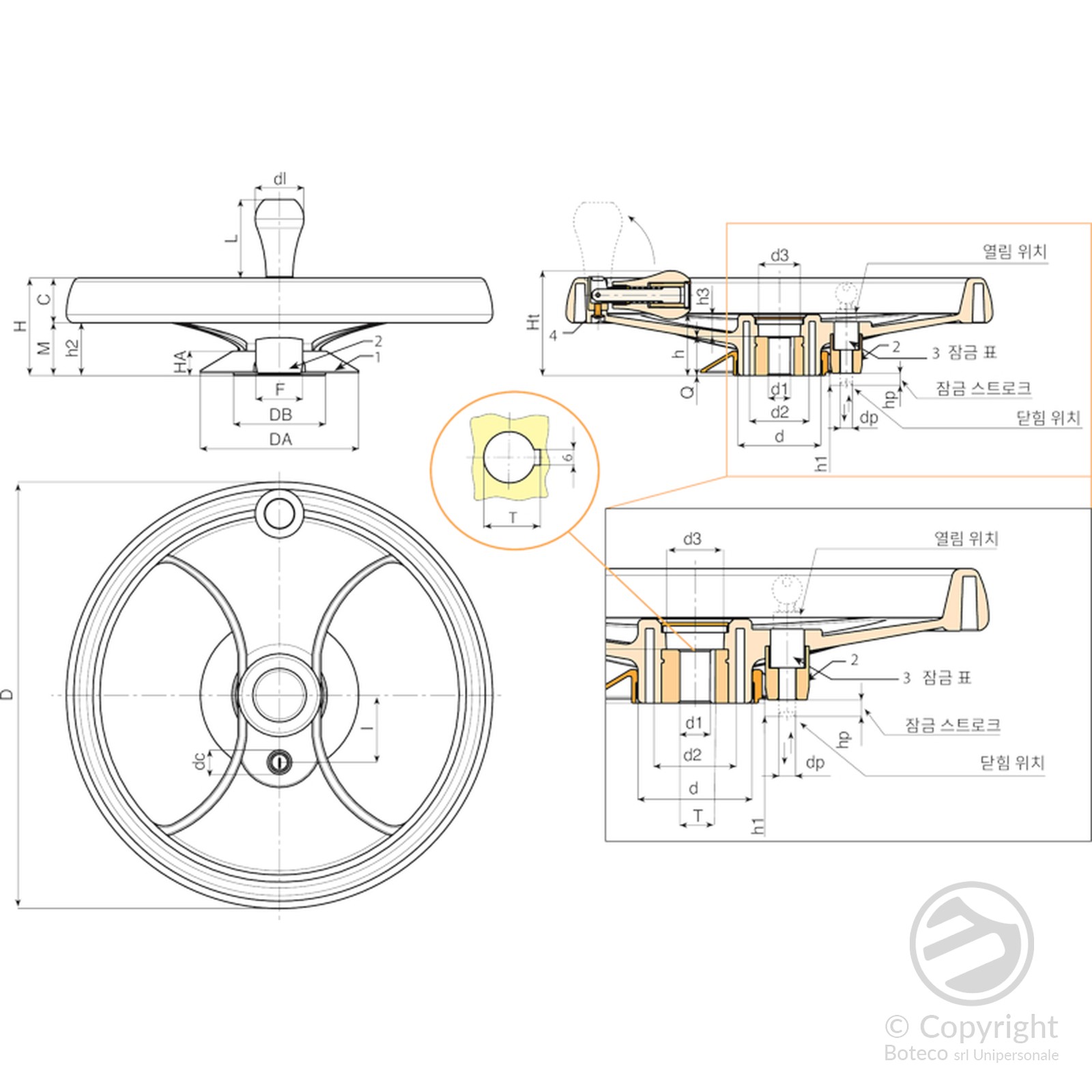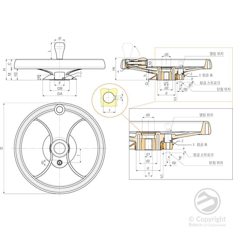 육각형 연결 방식의 M202 "유로모델" 핸드휠에 매끄럽게 접히는 회전식 핸들이 장착되어 있습니다. 핸들은 PA6+GF 재질에 RAL 9011 블랙 색상입니다. 내부 메커니즘은 흑색 산화 처리되었습니다. ISO 7838 규격의 흑색 산화 처리된 육각 소켓 버튼 헤드 나사로 고정됩니다. 핸들 캡은 회색 폴리아미드(RAL 7035 코드 13) 재질입니다.
