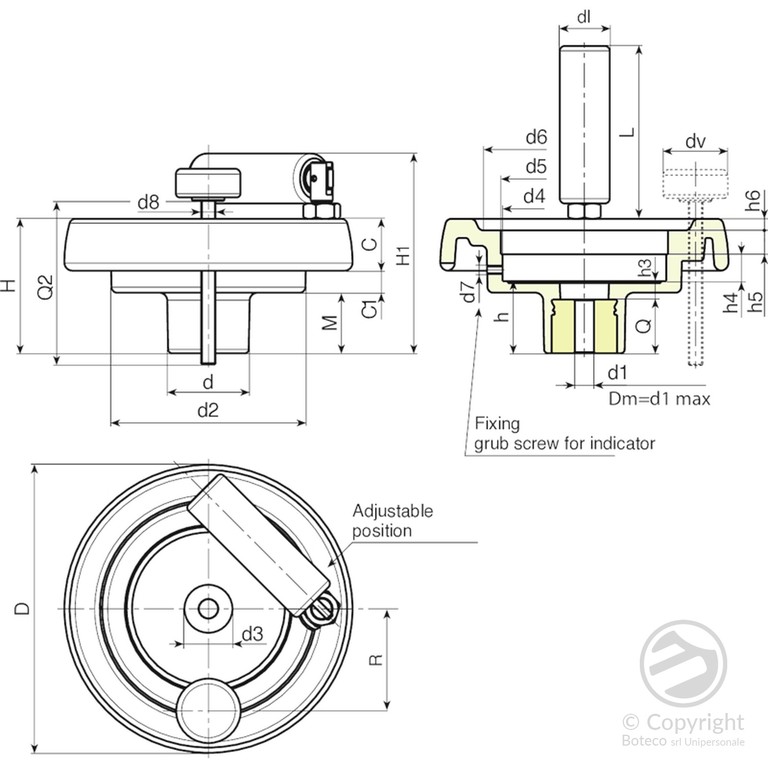 중력 인디게이터 K650 또는 K660 시리즈 사용. 인디게이터는 수평 축 기계에서 사용 가능. 인디게이터와 그러브 나사(d7)는 별도 구매품. 자세한 설명은 페이지 K-24/25 참고. (*) 어댑터 KS08050.T01에는 인디게이터 K650080 사용 가능. FAM_K650-Codice 그리고 페이지 FAM_K660-Codice ].