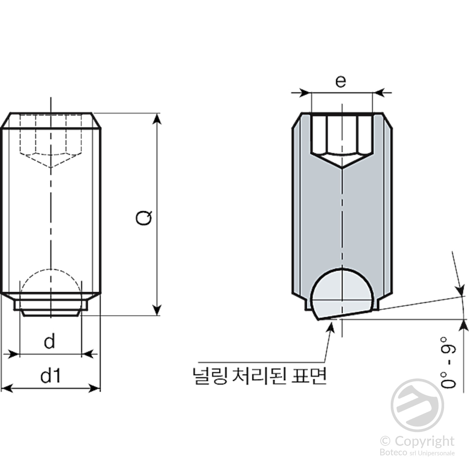 표면이 평평하고 널링 처리된 경화 스테인리스 스틸 볼(AISI 420). 최적 각도 조절 범위는 0°~9°. 볼은 고정되어 있지 않고 회전할 수 있습니다.