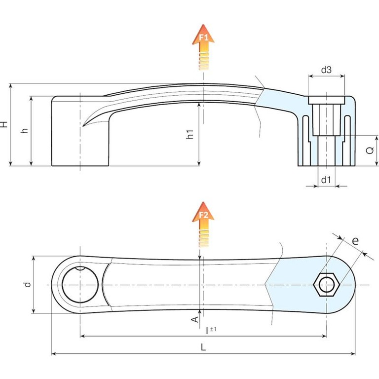 | Code | art. | L | I ±1 | H | h | h1 | A | d | d3 | e | Q | d1 | Gewicht (g) | F1 (N) | F2 (N) |