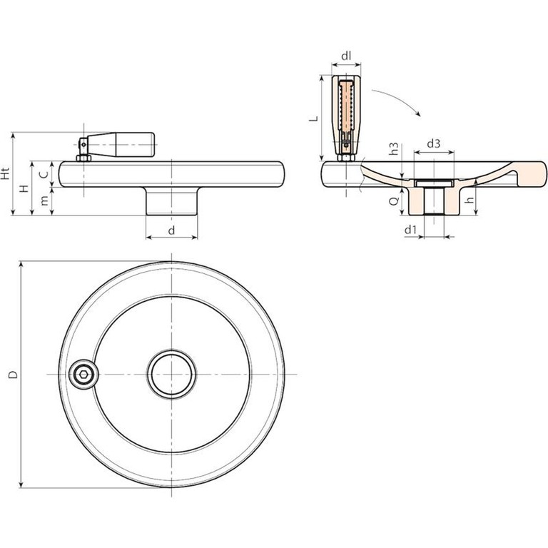 Op aanvraag en voor grote hoeveelheden kunnen de handwielen worden geleverd met een gepersonaliseerde boring d1.