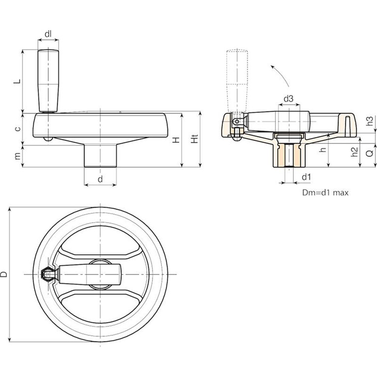 | Code | Art. | D | H | Ht | h | d | m | c | h2 | h3 | d3 | dl | L | Dm | d1 H10 | Q | Gewicht (g) |