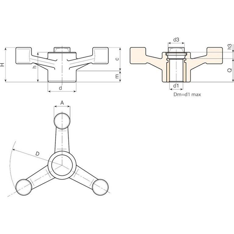 | Code | Art. | D | H | h | d | m | c | A | h3 | d3 | Dm | d1 H10 | Q | Gewicht (g) |