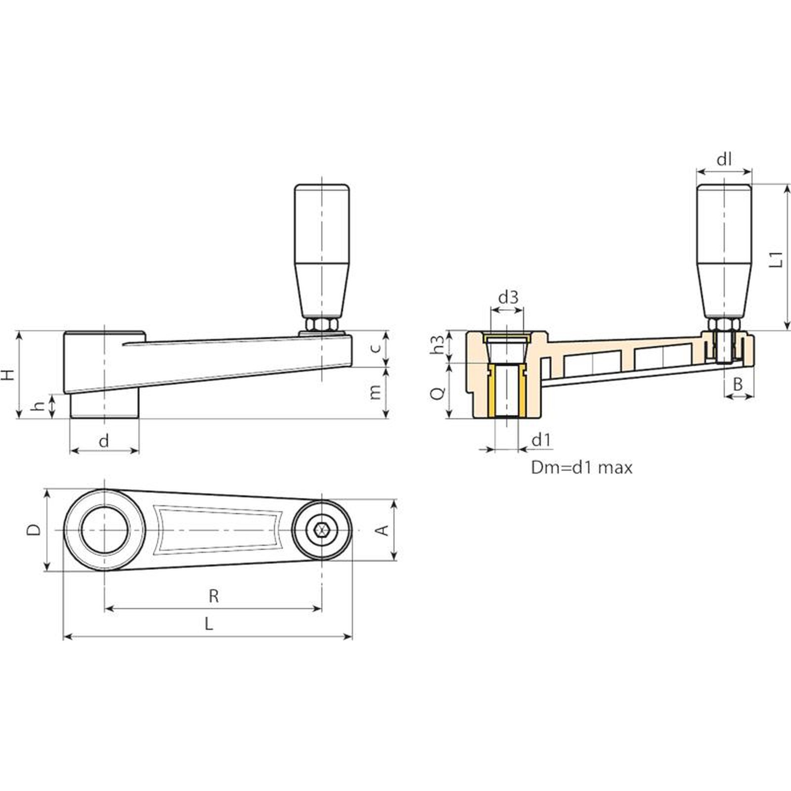 | Code | Art. | L | R | H | D | d | m | c | A | B | h | d3 | h3 | dm | d1 H10 | Q | dl | L1 | Gewicht (g) |