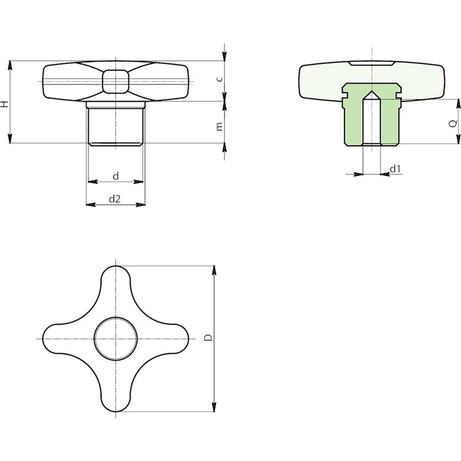 | Code | Art. | D | d | d2 | H | m | c | d1 H9 | Q | Gewicht (g) |