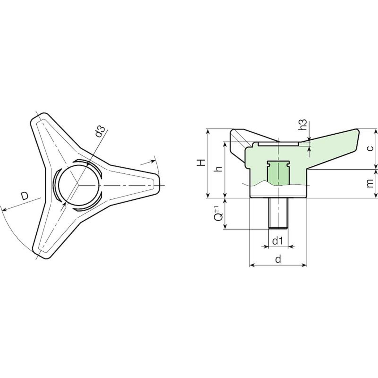 | Code | art. | D | H | h | d | c | m | d3 | h3 | LM | d1 6g | Q | Gewicht (g) |