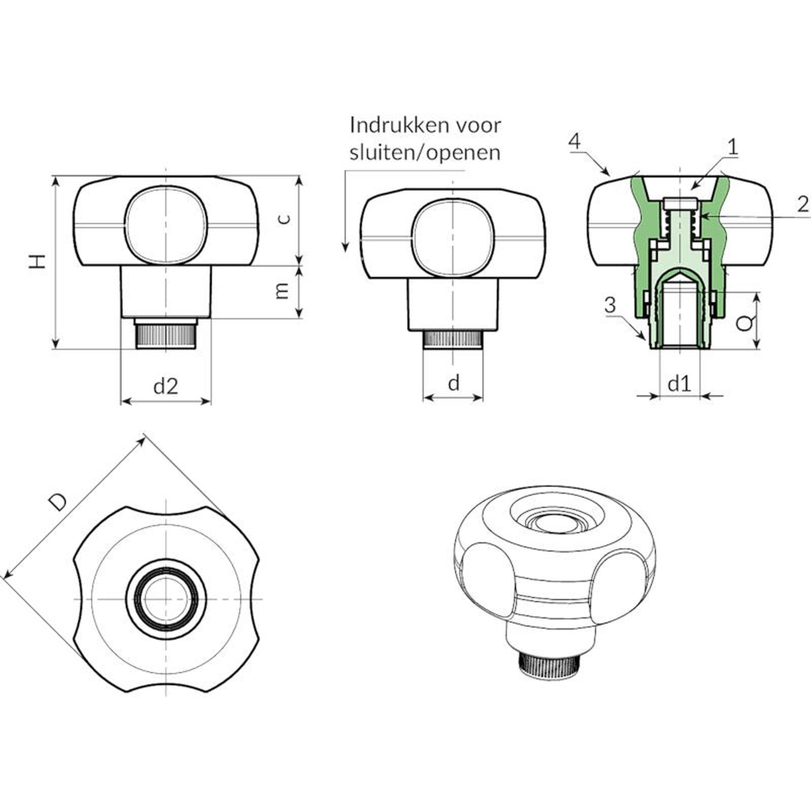 4-LOBBIGE STERKNOP MET GEÏNDEXEERD INZETSTUK (INDRUKKEN VOOR GEBRUIK) EN DRAADBUS