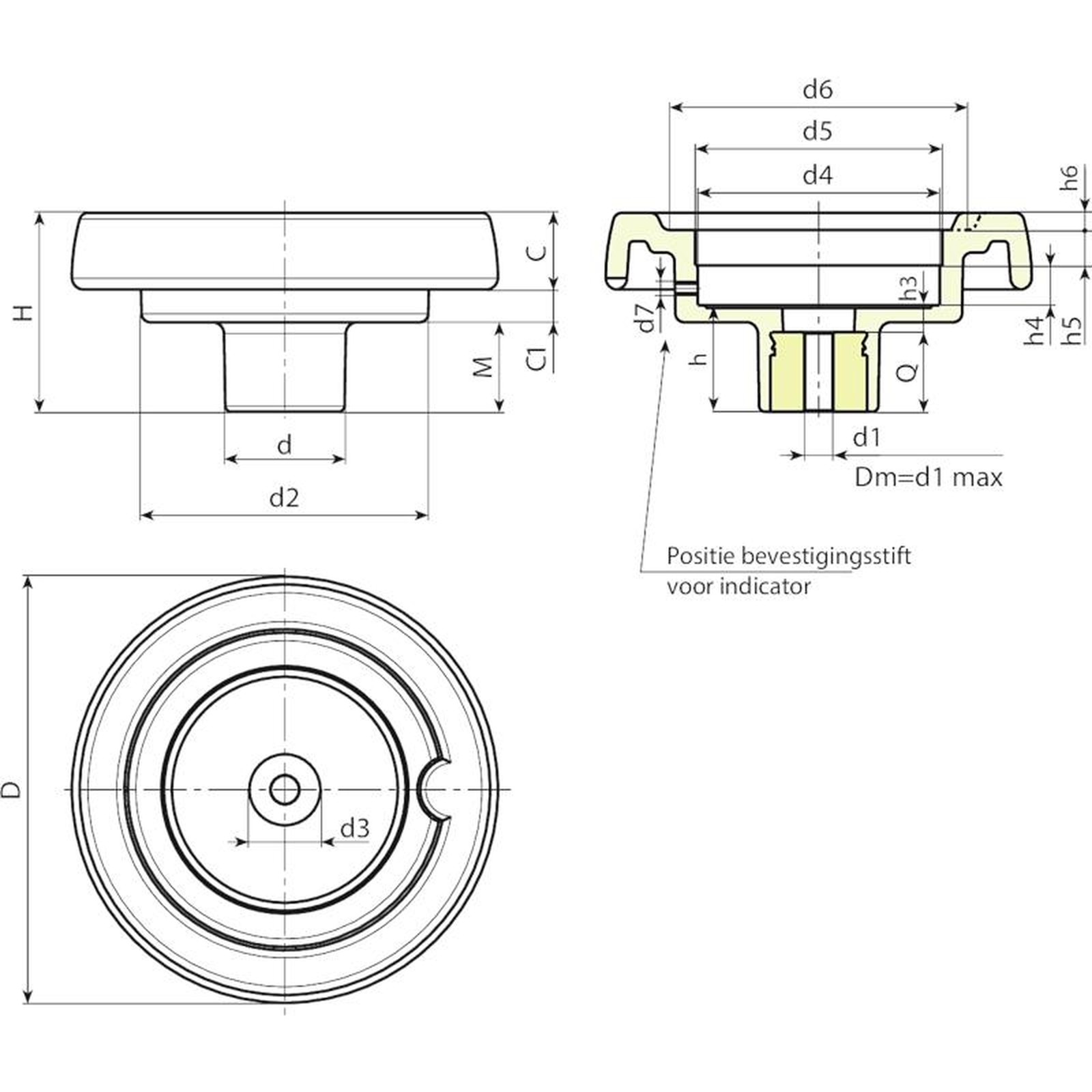 | Code | art. | D | H | d | d2 | M | C | C1 | d3 | d4 | d5 | d6 | d7 | h | h3 | h4 | h5 | h6 | Dm | d1 | Q | Gewicht (g) |