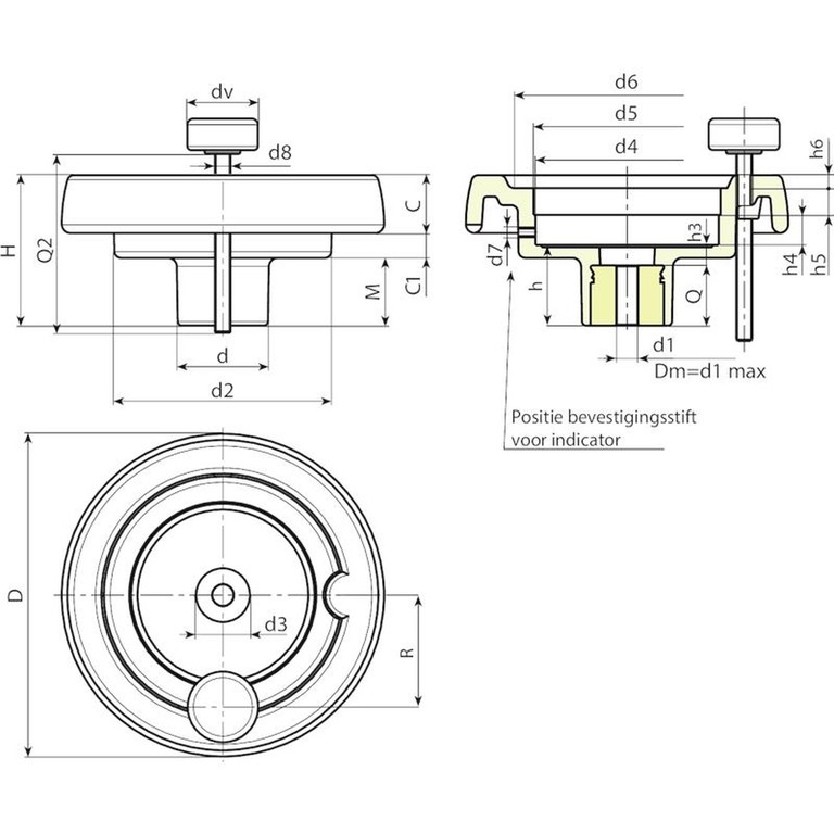 SCHIJFHANDWIEL MET ZITTING VOOR POSITIE-INDICATOR EN BORGINGSKNOP