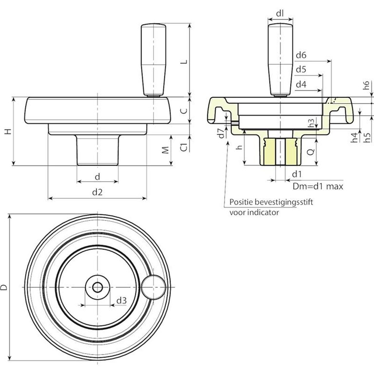 SCHIJFHANDWIEL MET ZITTING VOOR POSITIE-INDICATOR EN DRAAIBARE GREEP M129