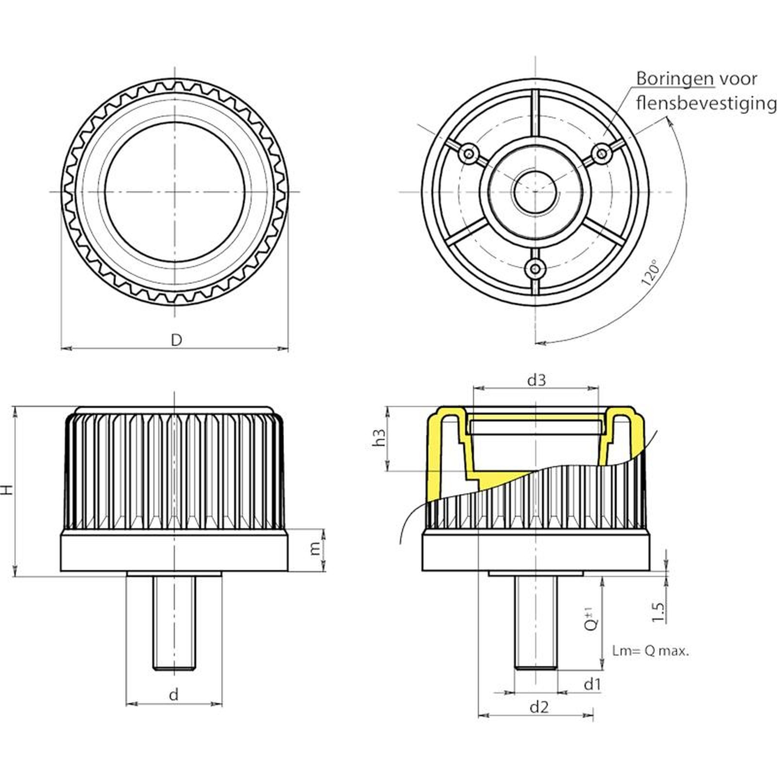 | Code | Art. | D | H | m | d | d2 | d3 | h3 | LM | d1 6g | Q | Gewicht (g) |