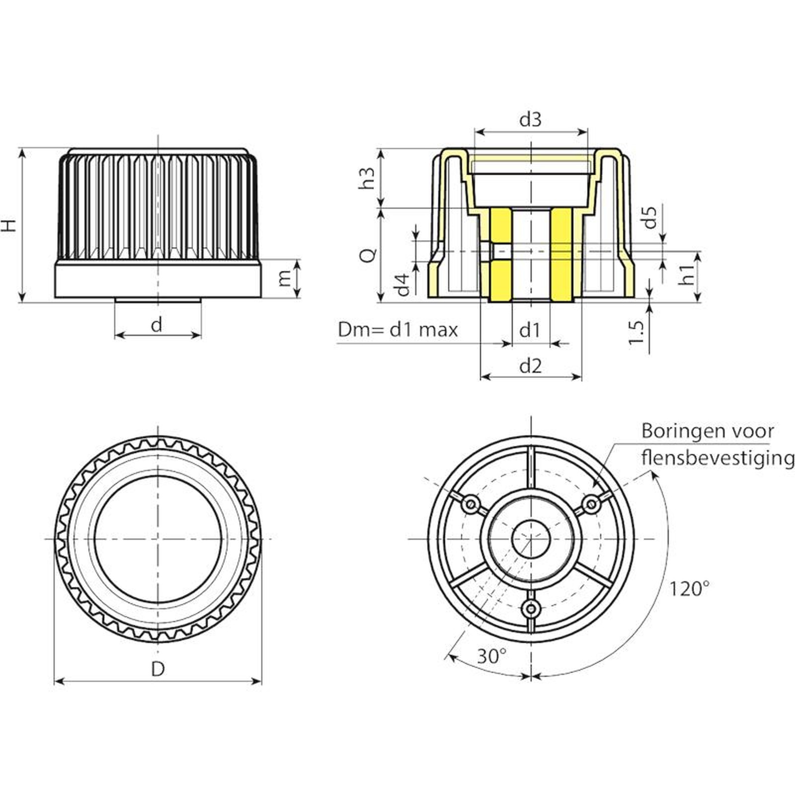 | Code | Art. | D | H | m | d | d2 | d3 | d4 | d5 | h1 | h3 | Dm | d1 H10 | Q | Gewicht (g) |