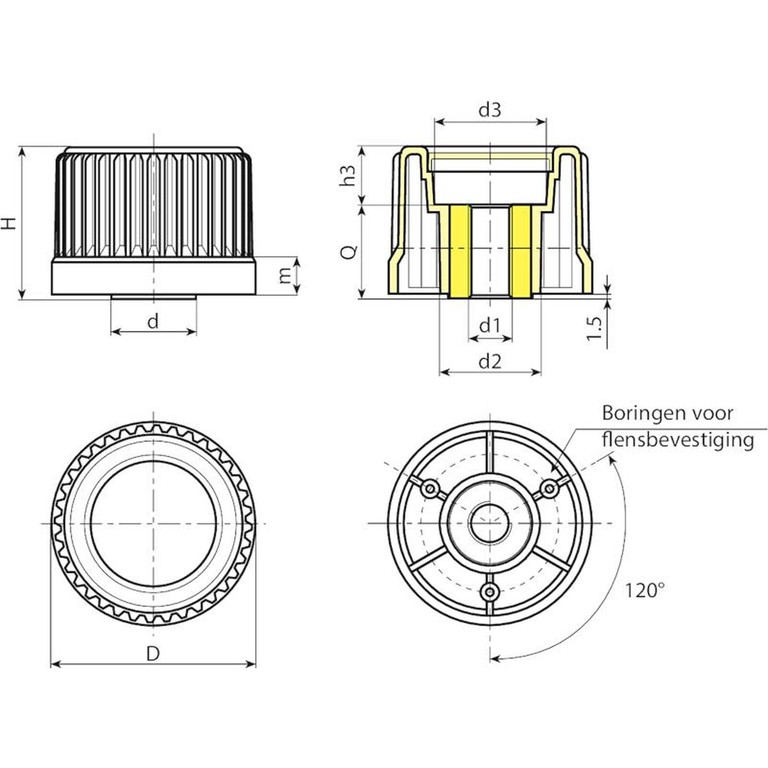 | Code | Art. | D | H | m | d | d2 | d3 | h3 | d1 6H | Q | Gewicht (g) |