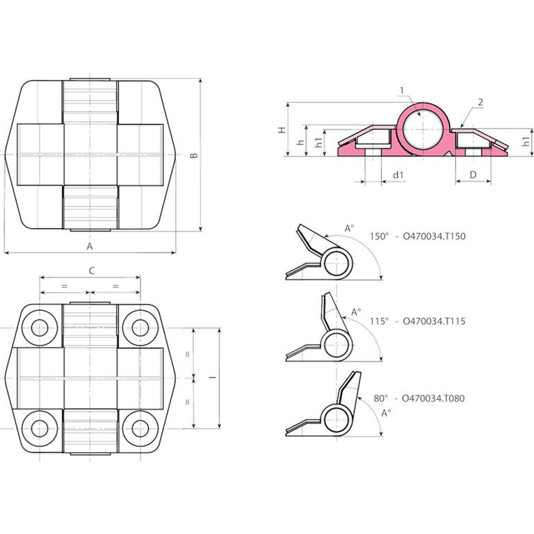 Opgelet: er is ook een scharnierversie verkrijgbaar zonder veren met vrije beweging tot 180° (code O470034.TG5.501).