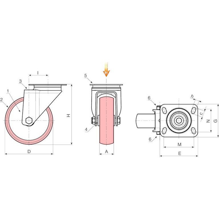 POLYAMIDE/POLYURETHAAN ZWENKWIEL MET RECHTHOEKIGE ZWENKPLAAT EN LAGERS IN STAAL (ZWARE REEKS)