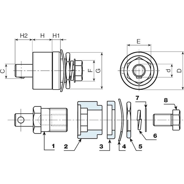 | Code | art. | D | H | H1 | H2 | d | c | E | F | G | Gewicht (g) | Amp. Max |