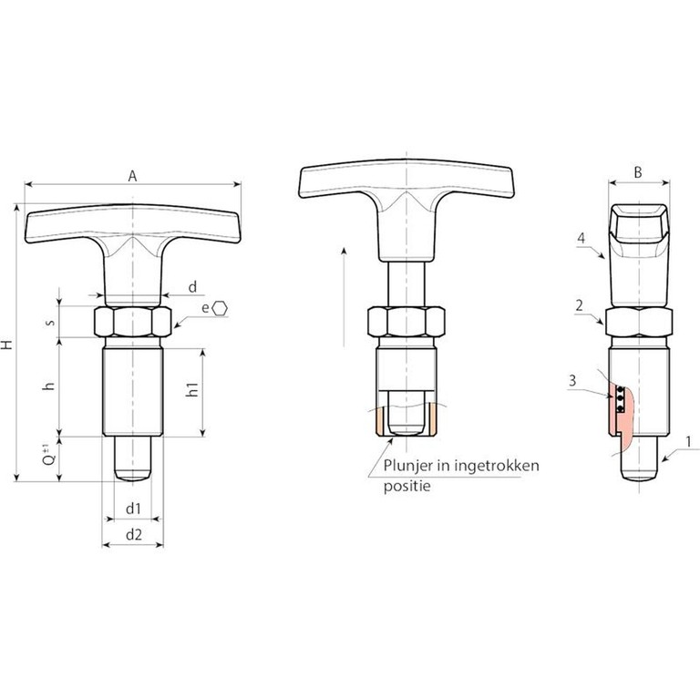 > Wij raden een tolerantie van H7 aan voor de boring van de zitting van de blokkeerboutstang.