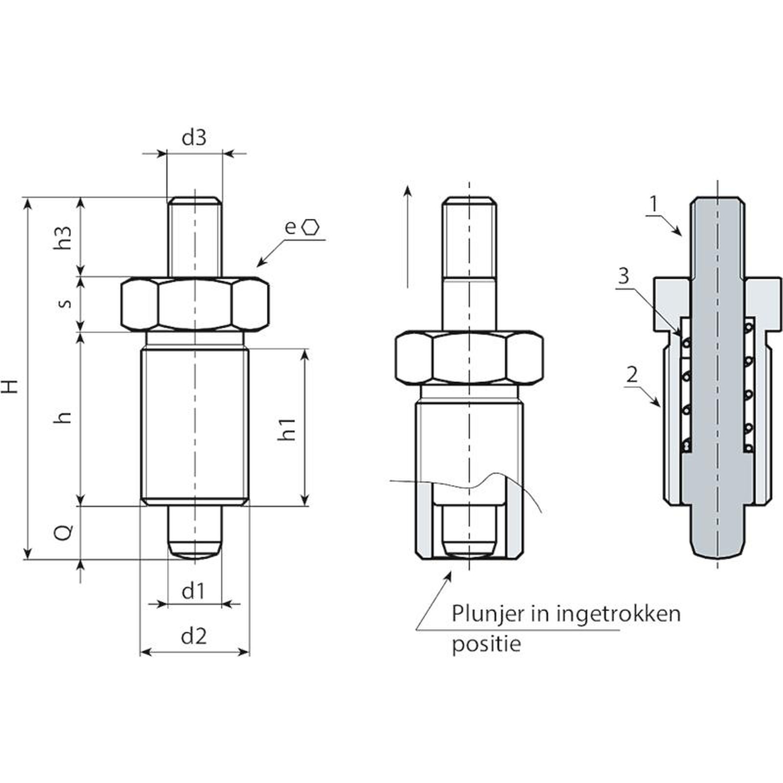 | Code | Art. | H | h | h1 | d2 | d3 | h3 | e | s | d1 -0,02 -0,04 | Q | Gewicht (g) |