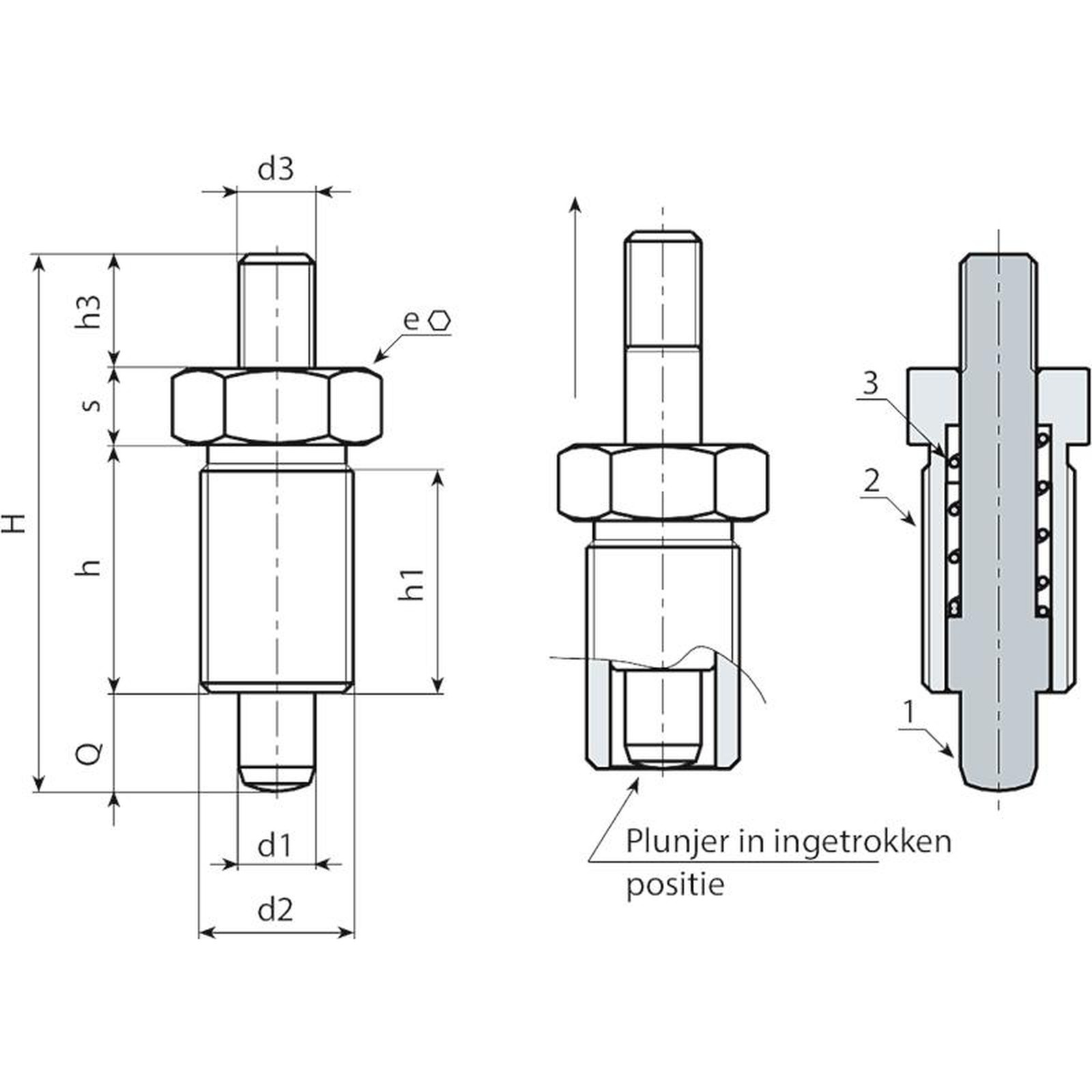 | Code | Art. | H | h | h1 | d2 | d3 | h3 | e | s | d1 -0,02 -0,04 | Q | Gewicht (g) |