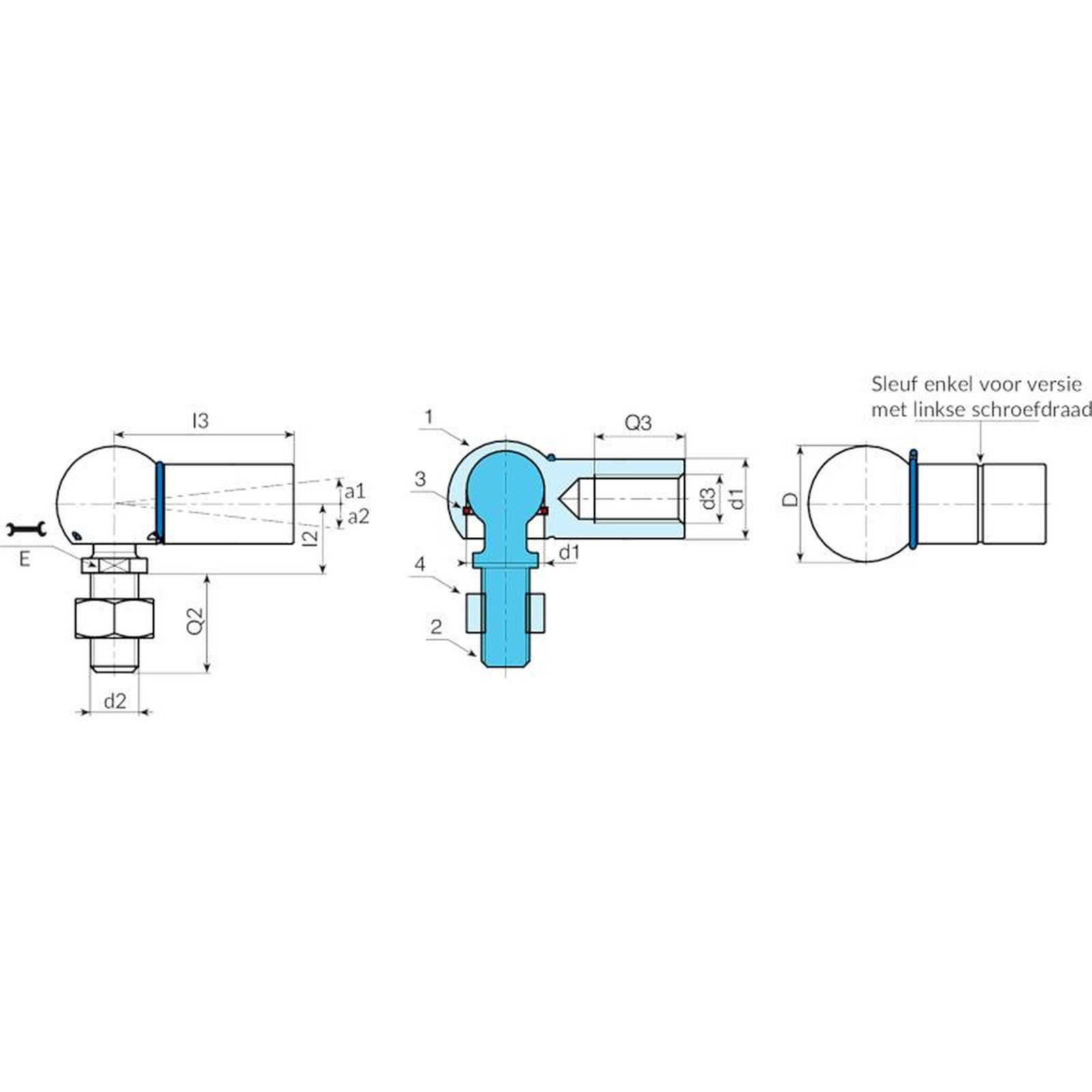 (2) Kogelscharnier met gefreesde sleutelzitting en draadeind in massief materiaal (tolerantie schroefdraad 6g).