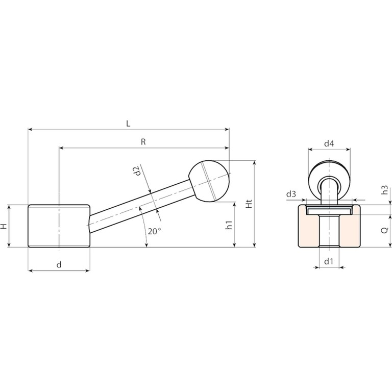 Kod | Art. | d | R | L | H | Ht | h1 | h3 | d2 | d3 | d4 | d1 H10 | Q | Waga (g) |