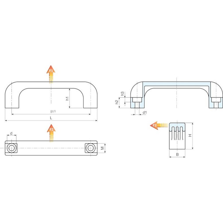 | Kod | art. | L | I ±1 | B | M | H | h1 | h2 | h3 | d | d1 | Waga (g) | F1 (N) | F2 (N) |