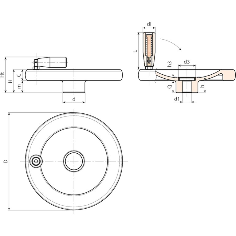 KOŁO RĘCZNE Z ALUMINIUM Z GŁADKIM OTWOREM I ZE SKŁADANĄ RĘKOJEŚCIĄ OBROTOWĄ