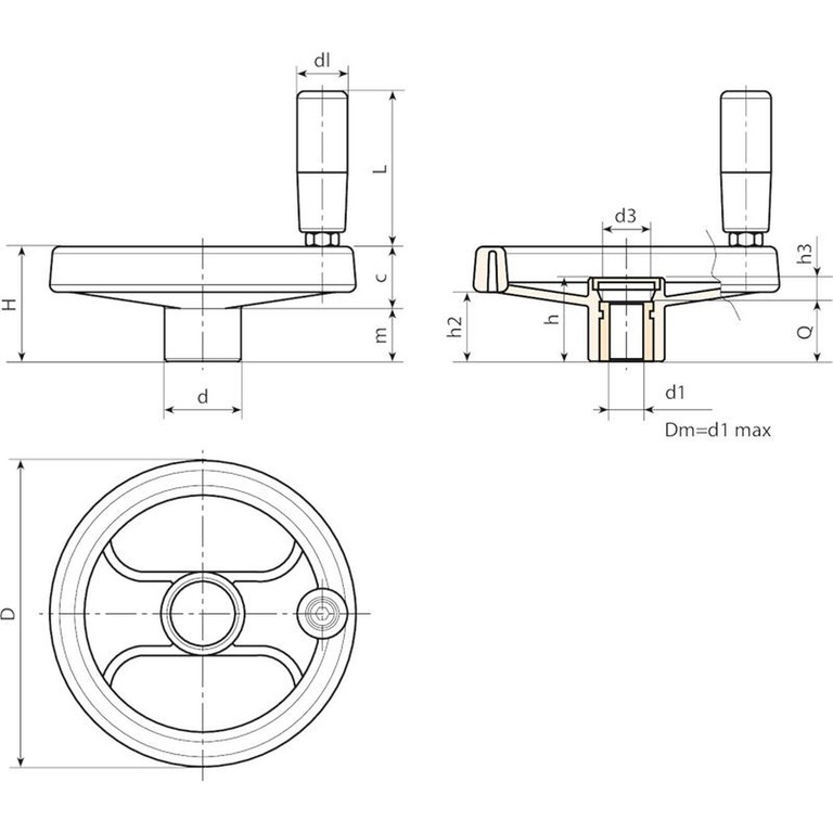 | Kod | Art. | D | H | h | d | m | c | h2 | h3 | d3 | dl | L | Dm | d1 H10 | Q | Waga (g) |