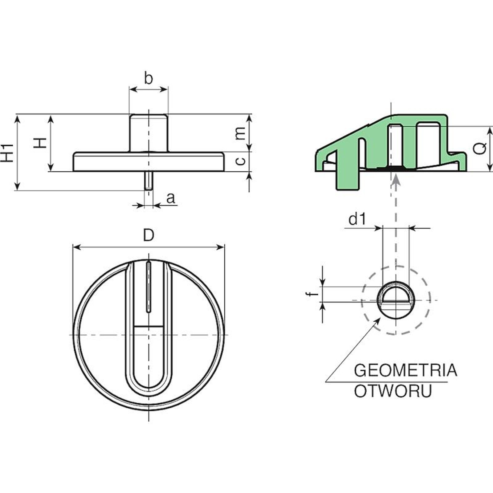 | Kod | art. | D | H | H1 | a | b | c | m | f | d1 | Q | Waga (g) |
