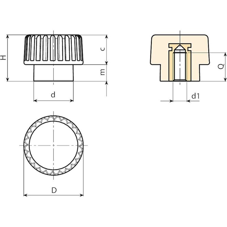 | Kod | art. | D | H | d | m | c | d1 6H | Q | Waga (g) |