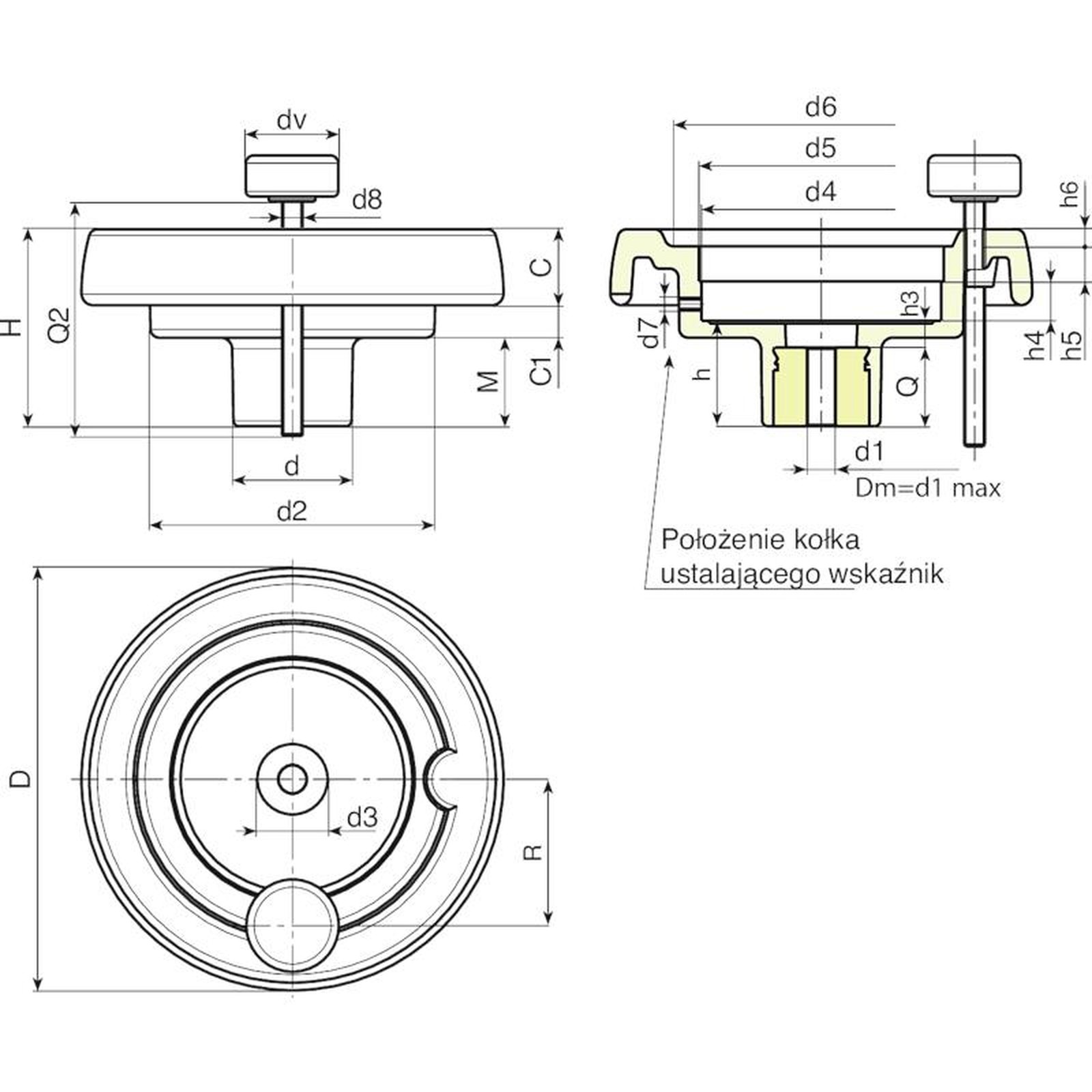 | Kod | art. | D | H | d | d2 | M | C | C1 | d3 | d4 | d5 | d6 | d7 | h | h3 | h4 | h5 | h6 | R | d8 | Dm | d1 | Q | Waga (g) |