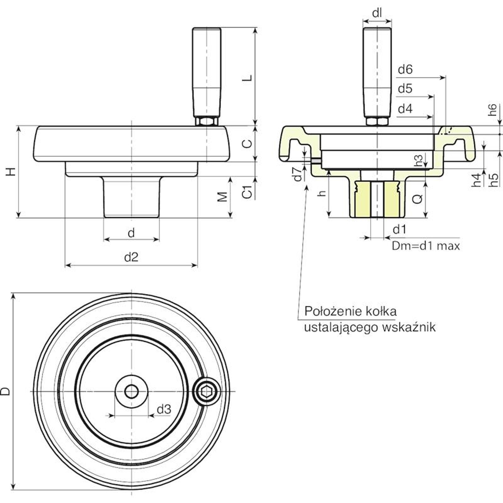 | Kod | art. | D | H | d | d2 | M | C | C1 | d3 | d4 | d5 | d6 | d7 | h | h3 | h4 | h5 | h6 | dl | L | Dm | d1 | Q | Waga (g) |