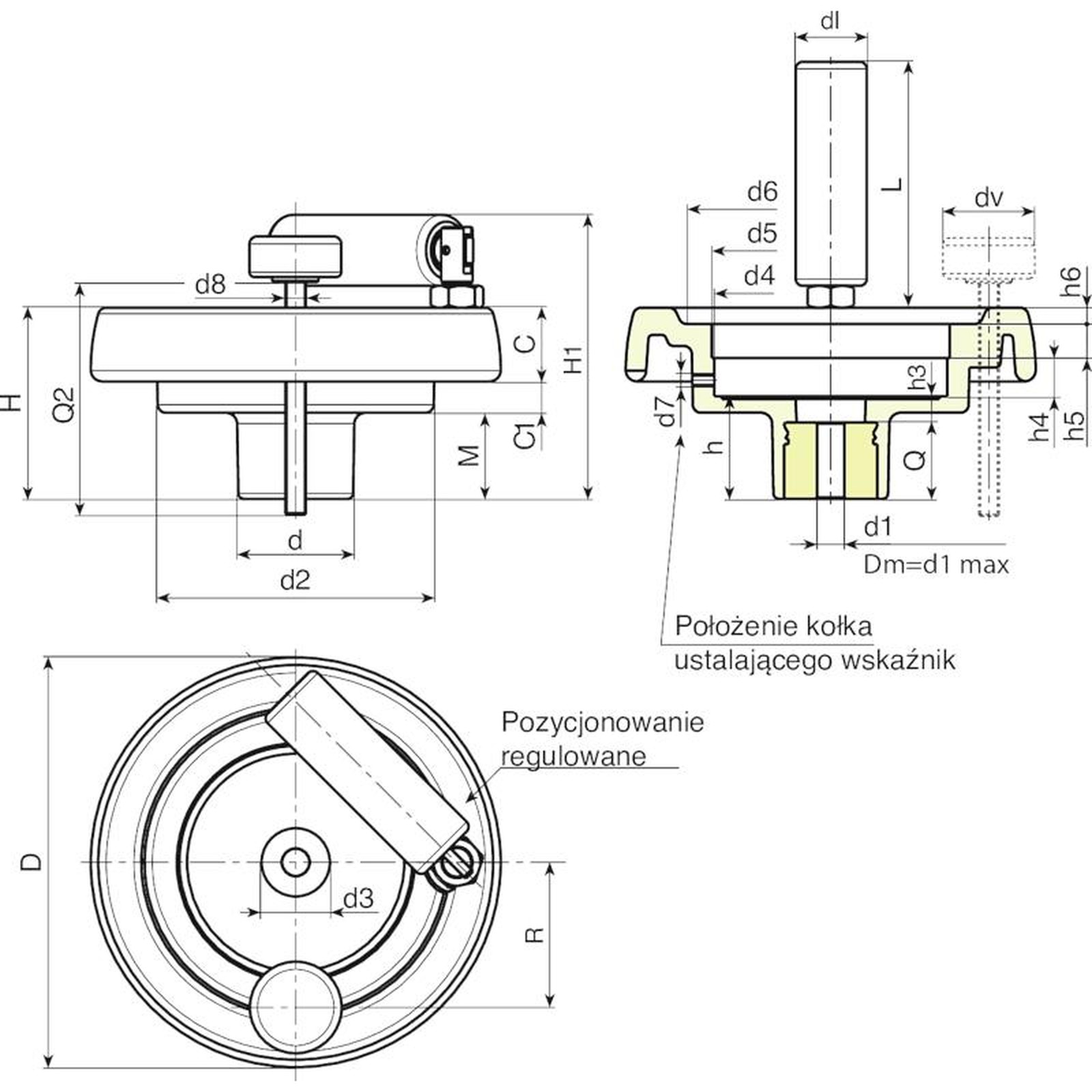 | Kod | art. | D | H | H1 | d | d2 | M | C | C1 | d3 | d4 | d5 | d6 | d7 | h | h3 | h4 | h5 | h6 | R | d8 | dl | L | Dm | d1 | Q | Waga (g) |