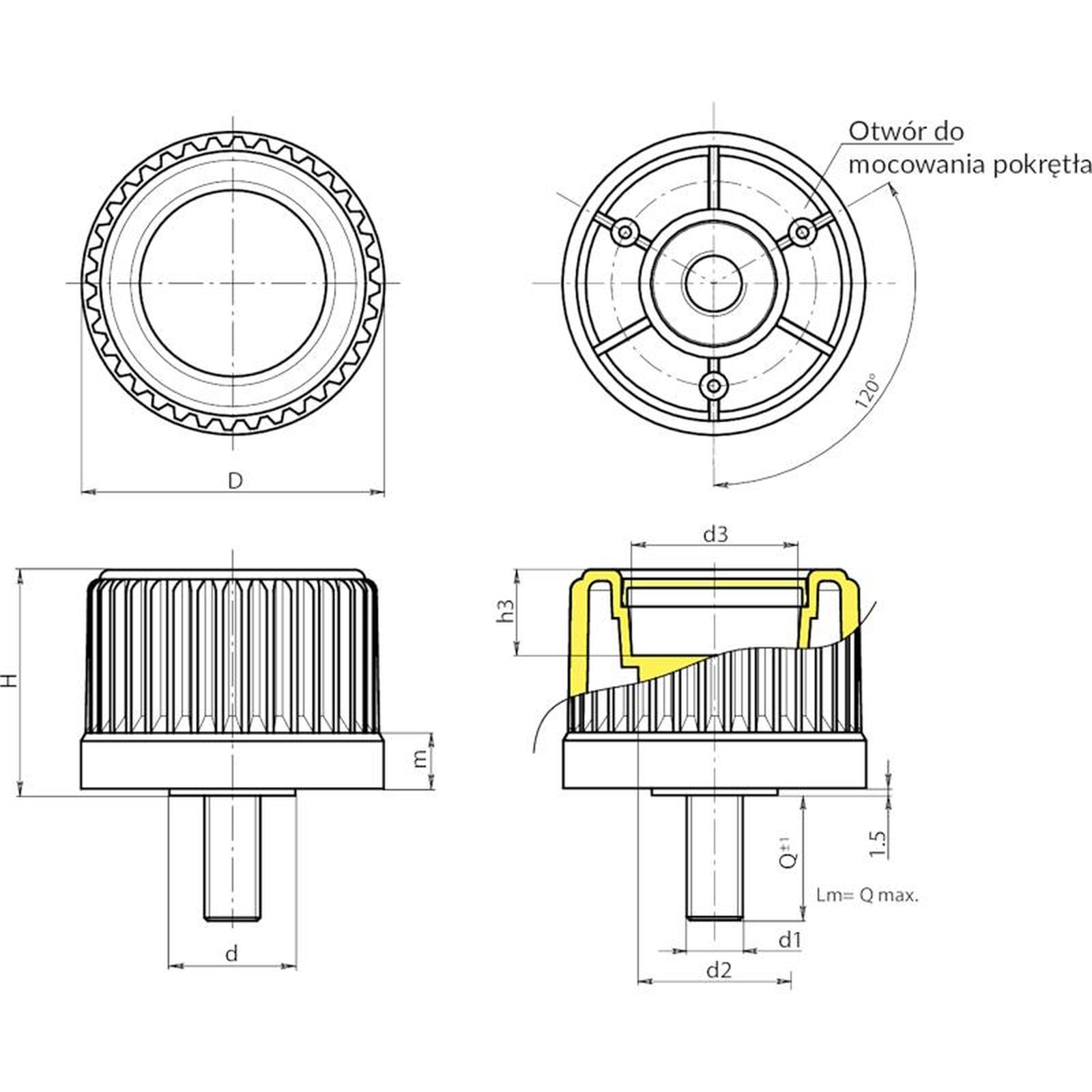 | Kod | Art. | D | H | m | d | d2 | d3 | h3 | LM | d1 6g | Q | Waga (g) |