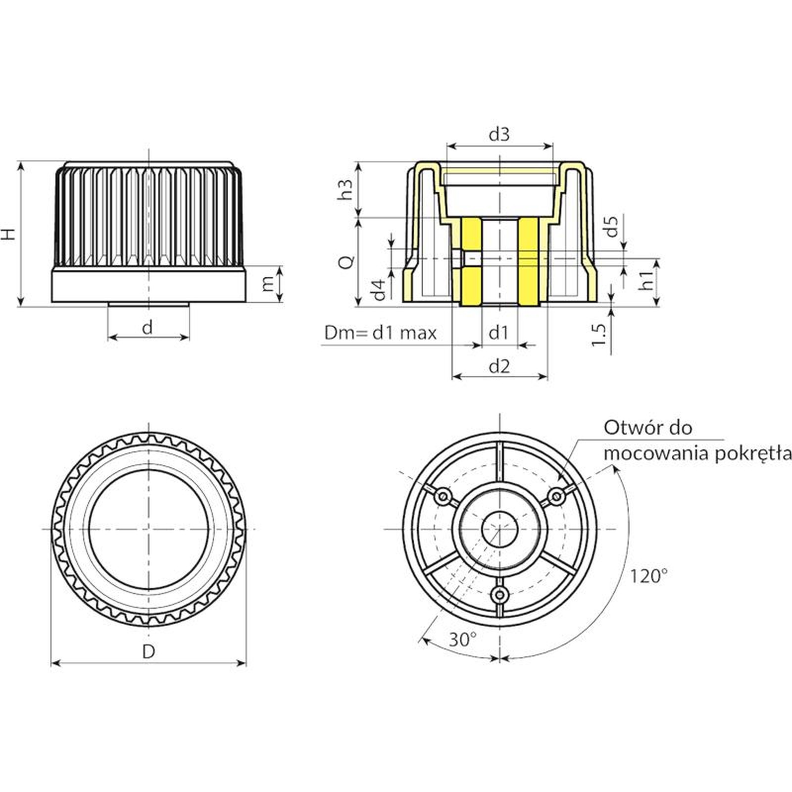 | Kod | Art. | D | H | m | d | d2 | d3 | d4 | d5 | h1 | h3 | Dm | d1 H10 | Q | Waga (g) |