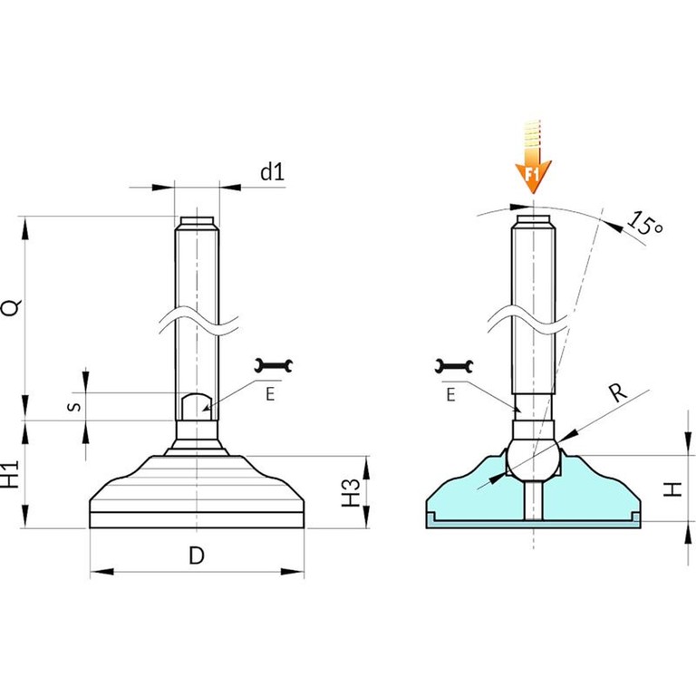 | Kod | Art. | D | H | H1 | H3 | E | s | R | d1 6g | Q | Waga (g) | F1|(kN) |