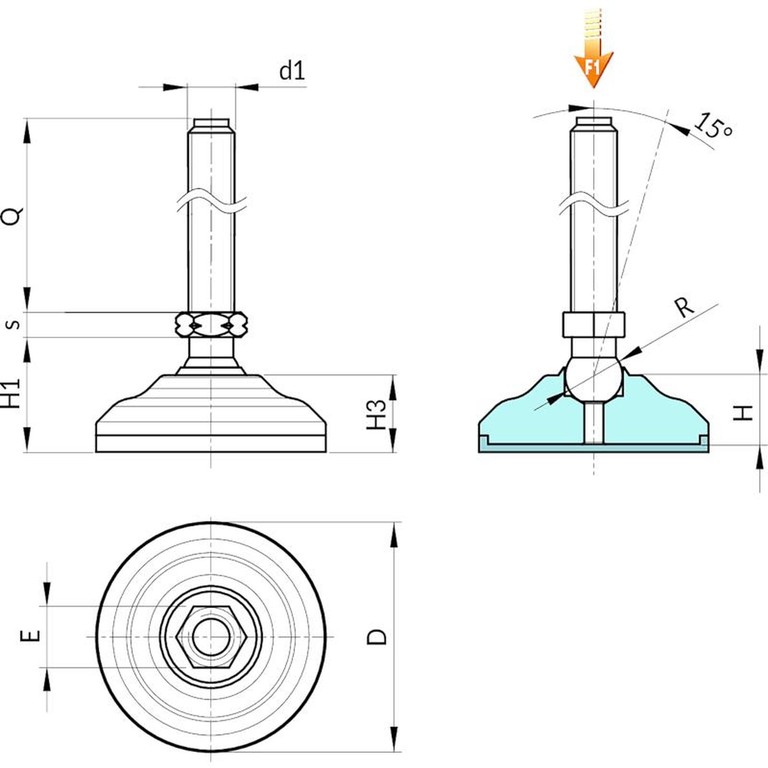 | Kod | Art. | D | H | H1 | H3 | E | s | R | d1 6g | Q | Waga (g) | F1|(kN) |