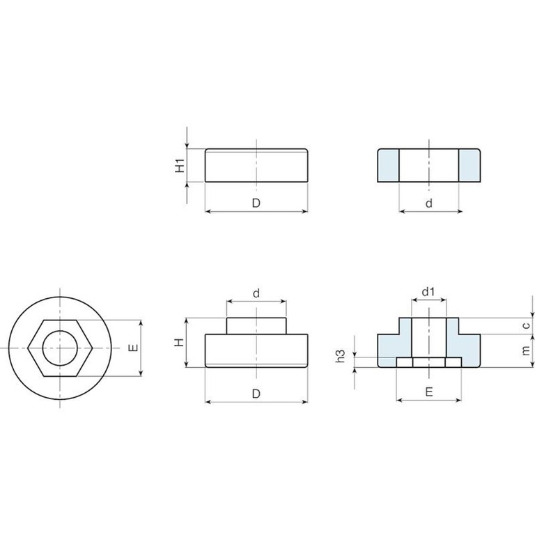 | Kod | art. | D | d | H | H1 | c | m | E | h3 | d1 | Waga (g) |