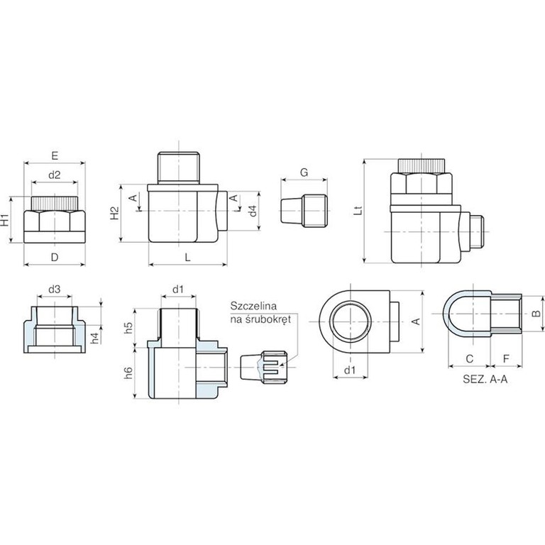 | Kod | art. | B | C | D | E | F | G | L | H1 | H2 | h4 | h5 | h6 | d1 | d2 | d3 | d4 | Lt | Waga (g) |