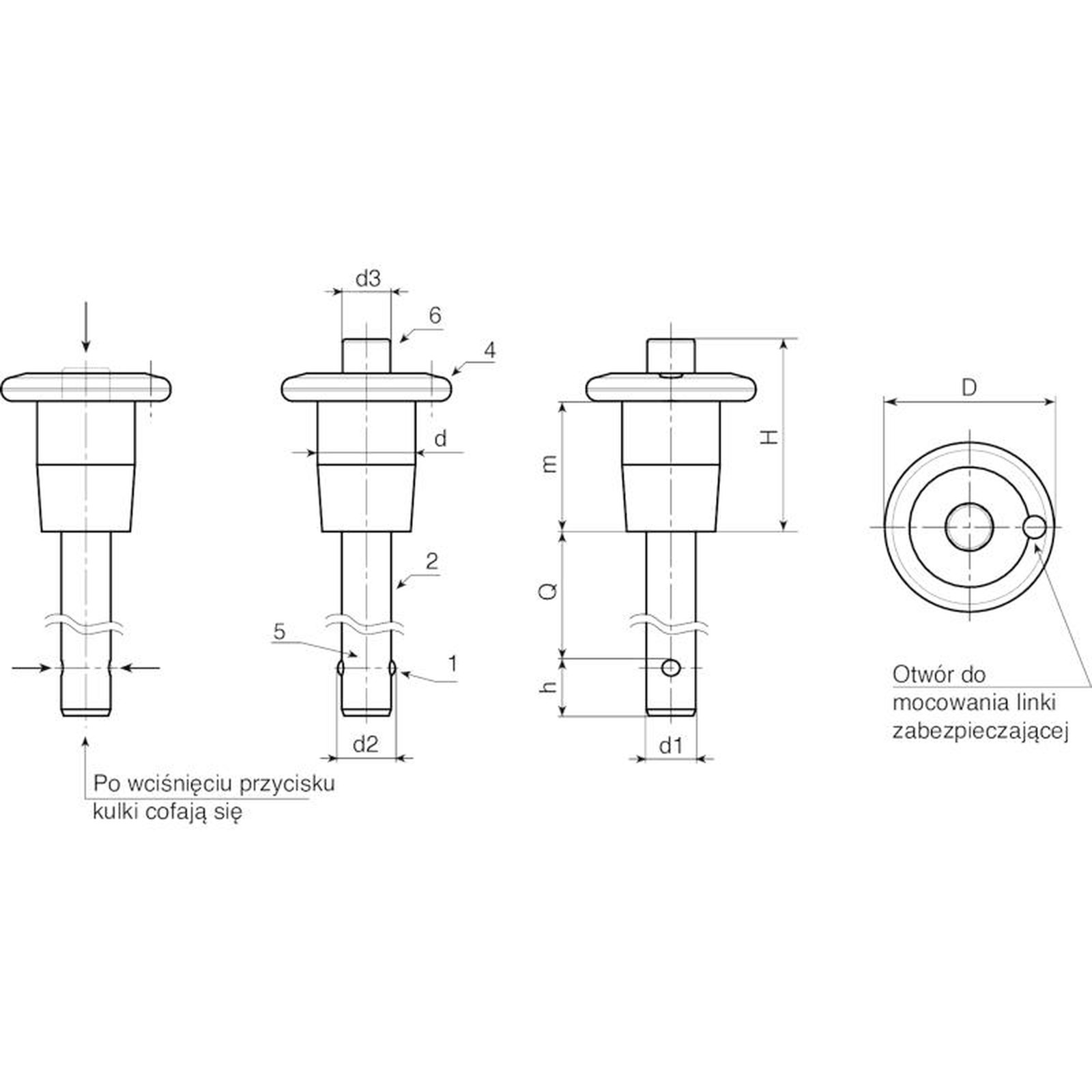 | Kod | Art. | D | H | m | d | d2 (±0.25) | d3 | d1 (-0,04 -0,08) | Q (+0.5) | h (±1) | Waga (g) |