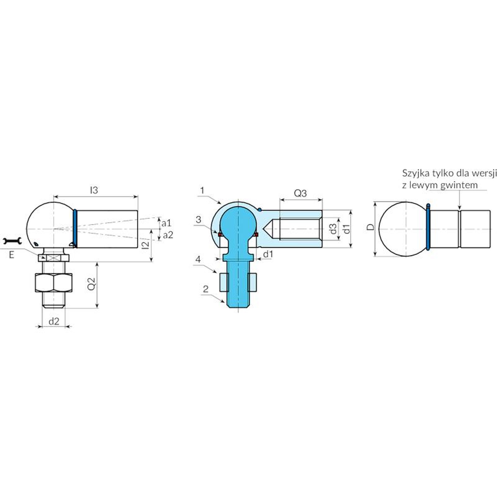 | Kod | Art. | d2 6g | d3 6H | D | E | I2 | I3 | Q2 | d1#r# h9-H9 | Q3 | a1 | a2 | Waga (g) |