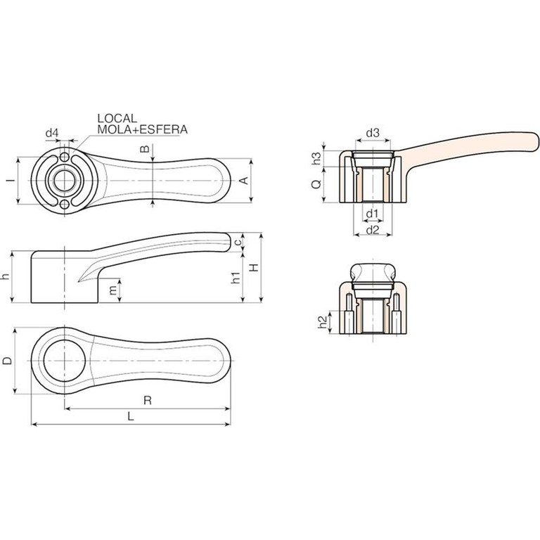 | Código | Art. | L | R | D | H | h | h1 | h2 | h3 | m | I | A | B | c | d2 | d3 | d4 | dm | d1 H10 | Q | Peso (g) |