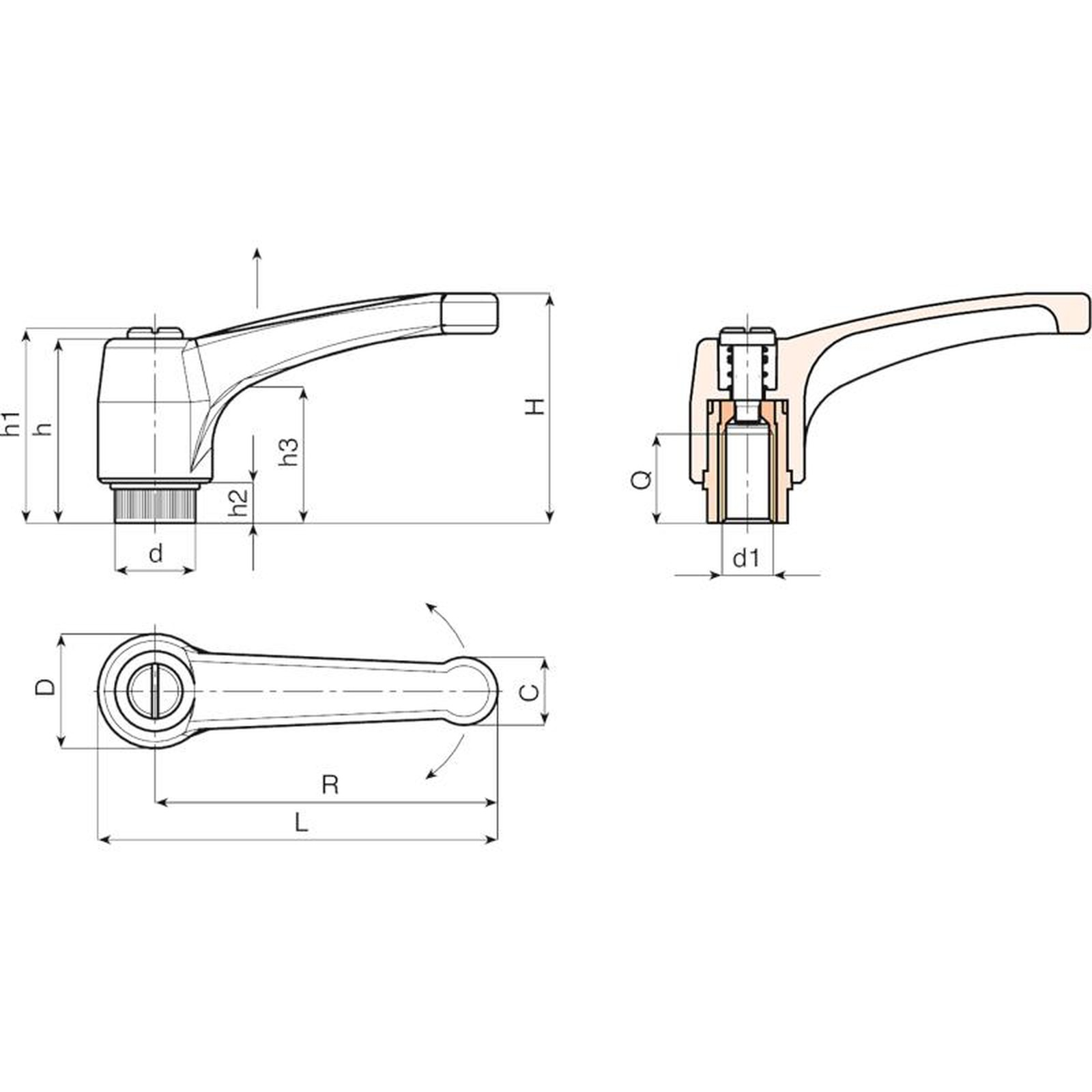 | Código | Art. | L | R | H | D | d | c | h | h1 | h2 | h3 | d1 6H | Q | Peso (g) |