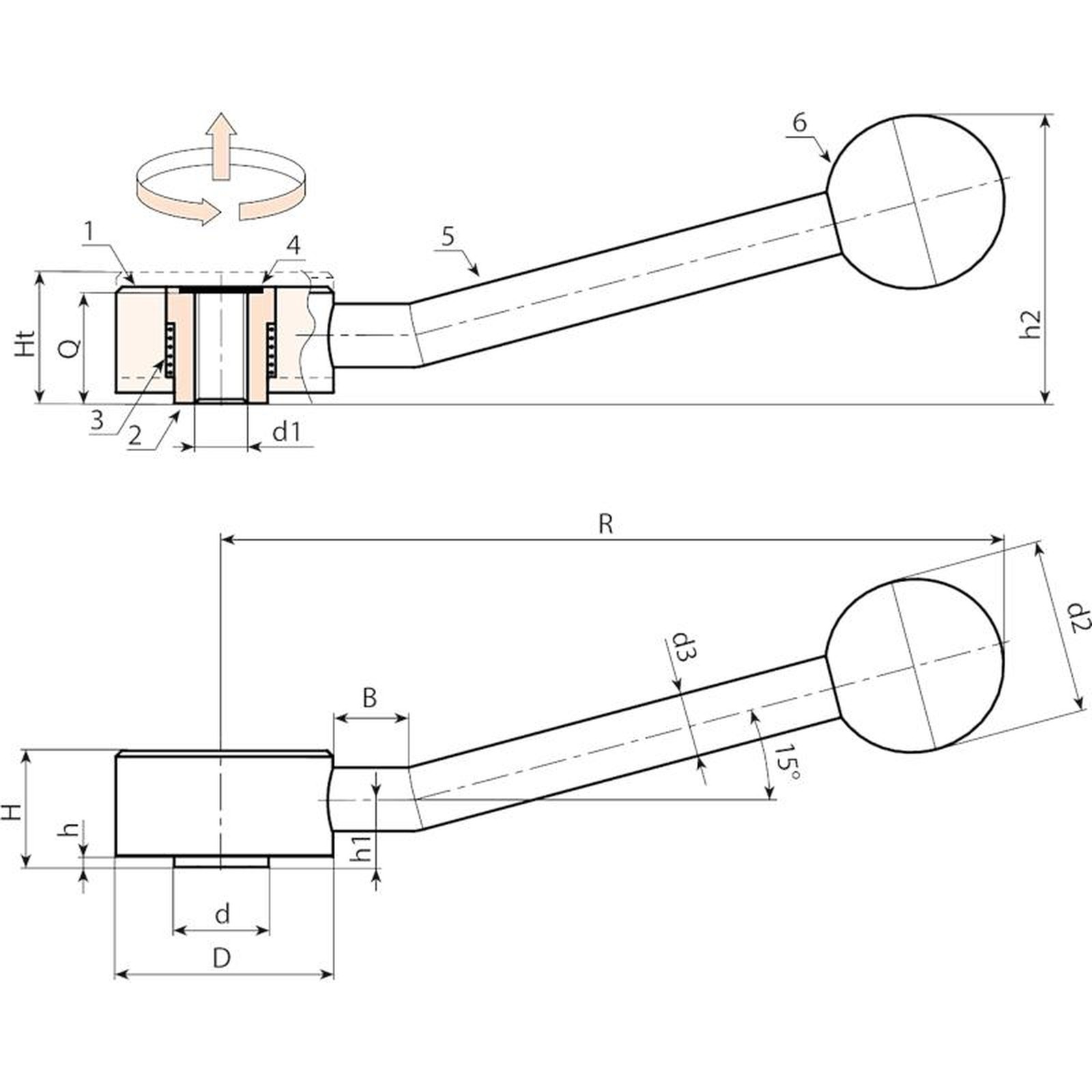 (1-2-5) Corpo da alavanca, braço e inserção de indexação em aço com classe de resistência 5.8.