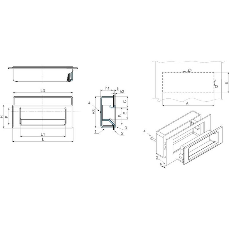 PUXADOR DE EMBUTIR L. 123mm. COM CAIXA TRASEIRA E FIXAÇÃO POR PARAFUSO