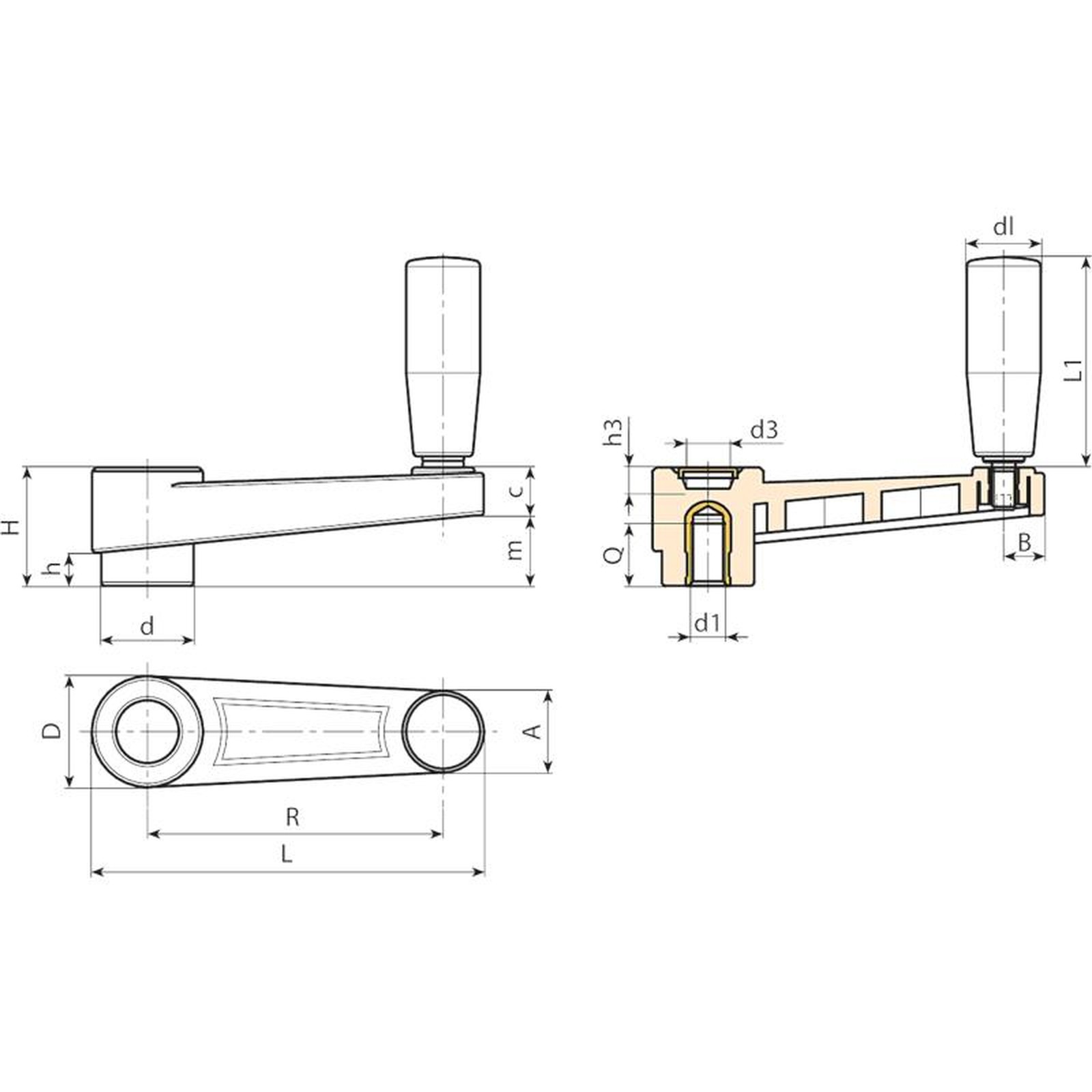 | Código | Art. | L | R | H | D | d | m | c | A | B | h | d3 | h3 | d1 6H | Q | dl | L1 | Peso (g) |