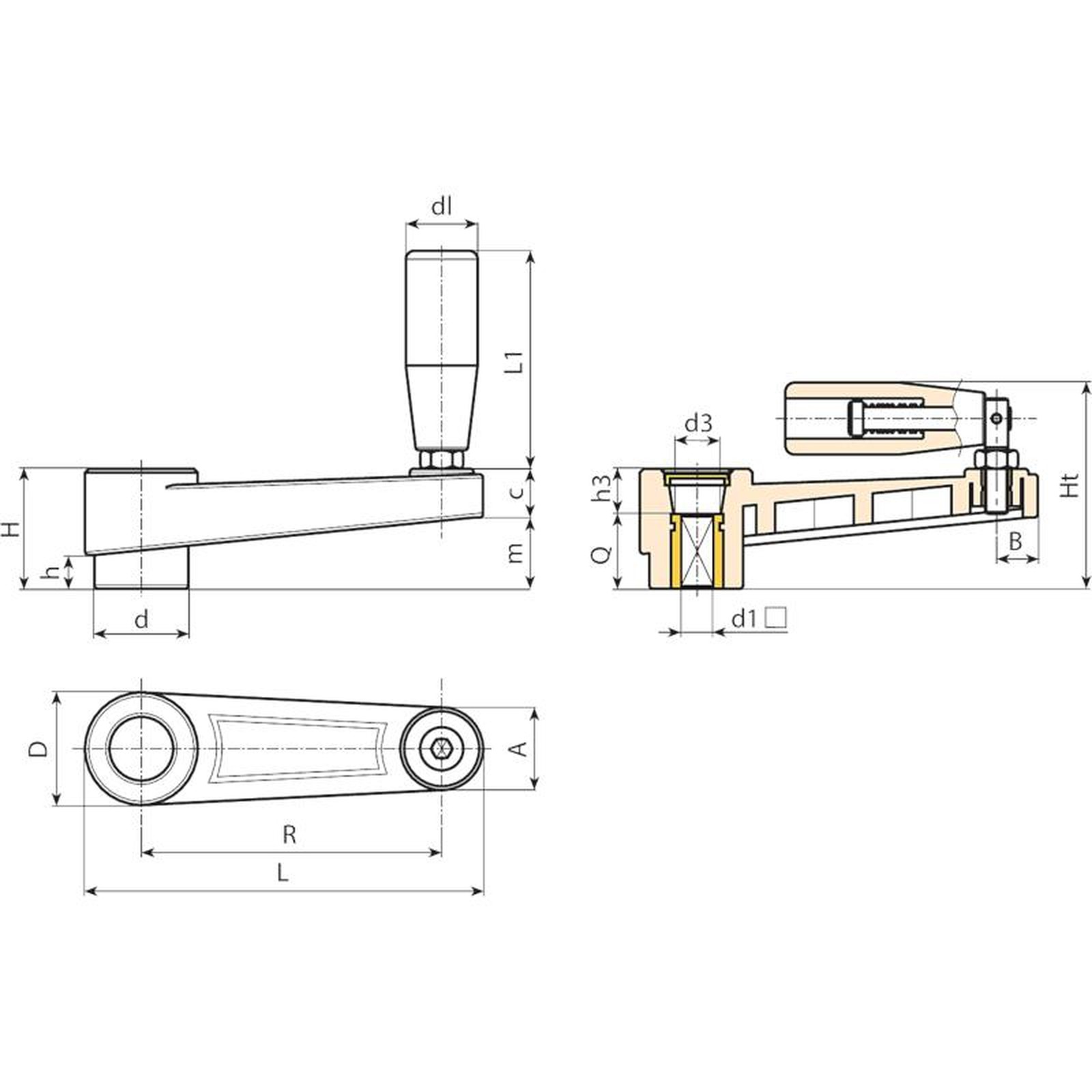 | Código | Art. | L | R | H | Ht | D | d | m | c | A | B | h | d3 | h3 | d1 H10 | Q | dl | L1 | Peso (g) |