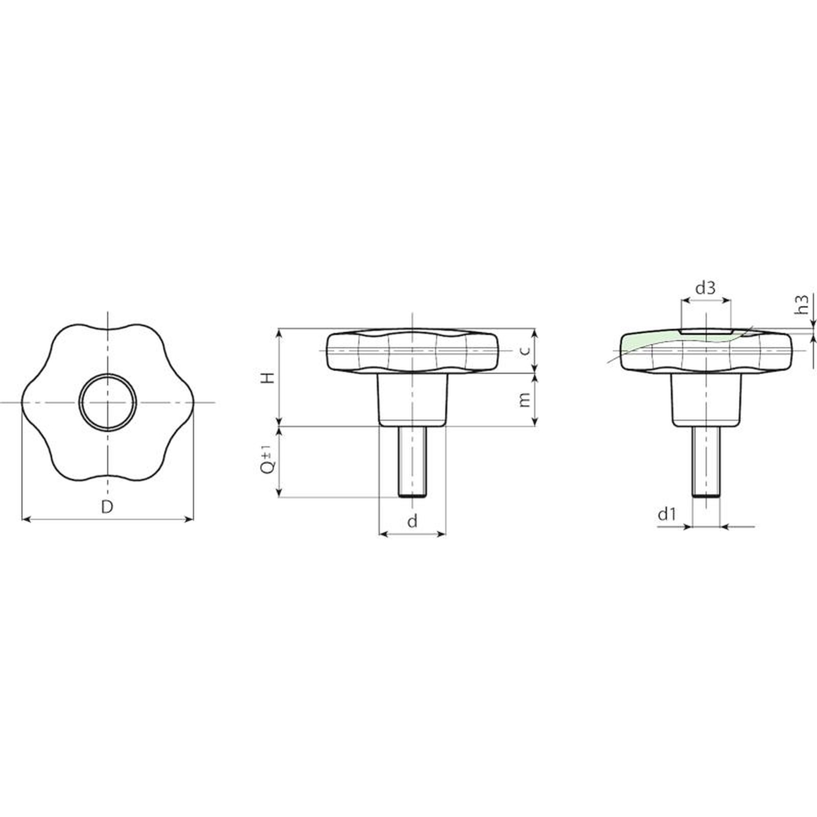 | Código | Art. | D | H | d | c | m | d3 | h3 | LM | d1 6g | Q | Peso (g) |